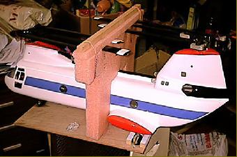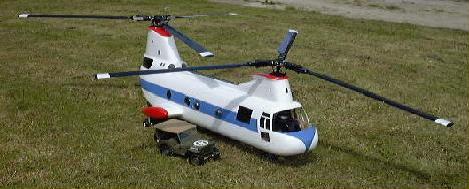 Hirobo Vertol (Chinook) OS 46H, 2 CSM180 Gyros Futaba PCM 9 channel Radio Note the carrying tray and blade support. Taking 6 blades off every flying day isn't funny. |